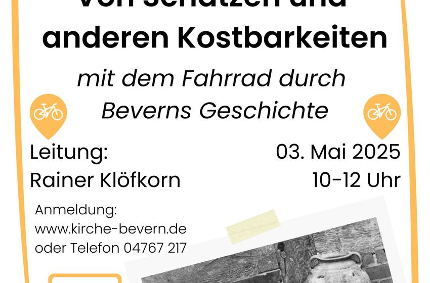 Zum zweiten Mal lädt die Kirchengemeinde Bevern zur Geschichtstour „Von Schätzen und anderen Kostbarkeiten“ ein. Am Samstag, 3. Mai geht es mit dem Fahrrad durch Bevern. Es sind alle eingeladen, ...