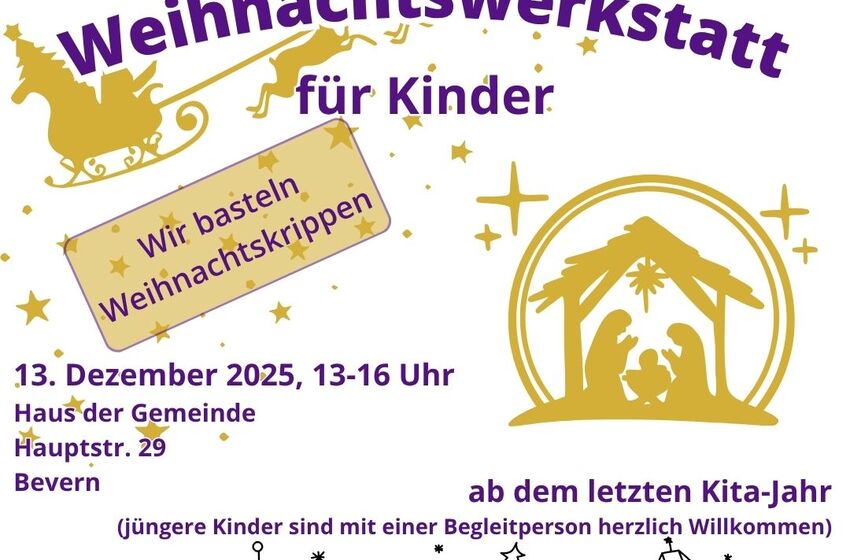 Am Samstag, 13. Dezember 2025 laden wir von 13 - 16 Uhr wieder alle Kinder ab dem letzten Kita-Jahr in unser Haus der Gemeinde, Hauptstr. 29 in Bevern ein. Jüngere Kinder können gerne mit ihren ...