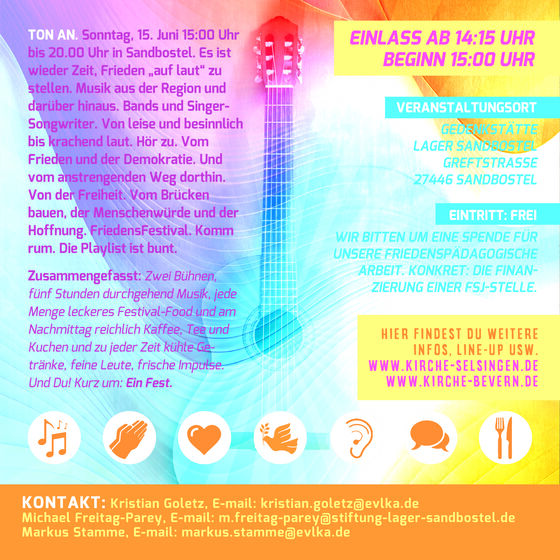 Am 15. Juni 2025 wird Sandbostel erneut zum Ort für Musik, Begegnung und gelebte Friedensarbeit: Wir stellen Frieden auf laut. Die Gedenkstätte Lager Sandbostel lädt gemeinsam mit den Kirchengemeinden Bevern, Gnarrenburg, Rhade und Selsingen sowie dem Kirchenkreis Bremervörde-Zeven zum dritten FriedensFestival auf das Gelände der Gedenkstätte Lager Sandbostel ein.
