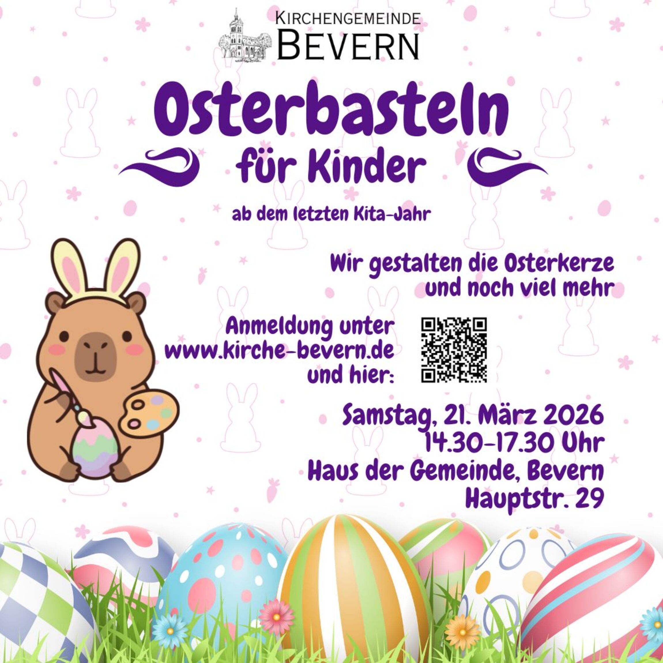 Am Samstag, 21. März 2026 von 14.30 - 17.30 Uhr wird im Haus der Gemeinde, Hauptstr. 29 in Bevern wieder alles rund um Ostern gebastelt und gestaltet. Und eine neue Osterkerze für die Kirche müssen wir auch herstellen.
