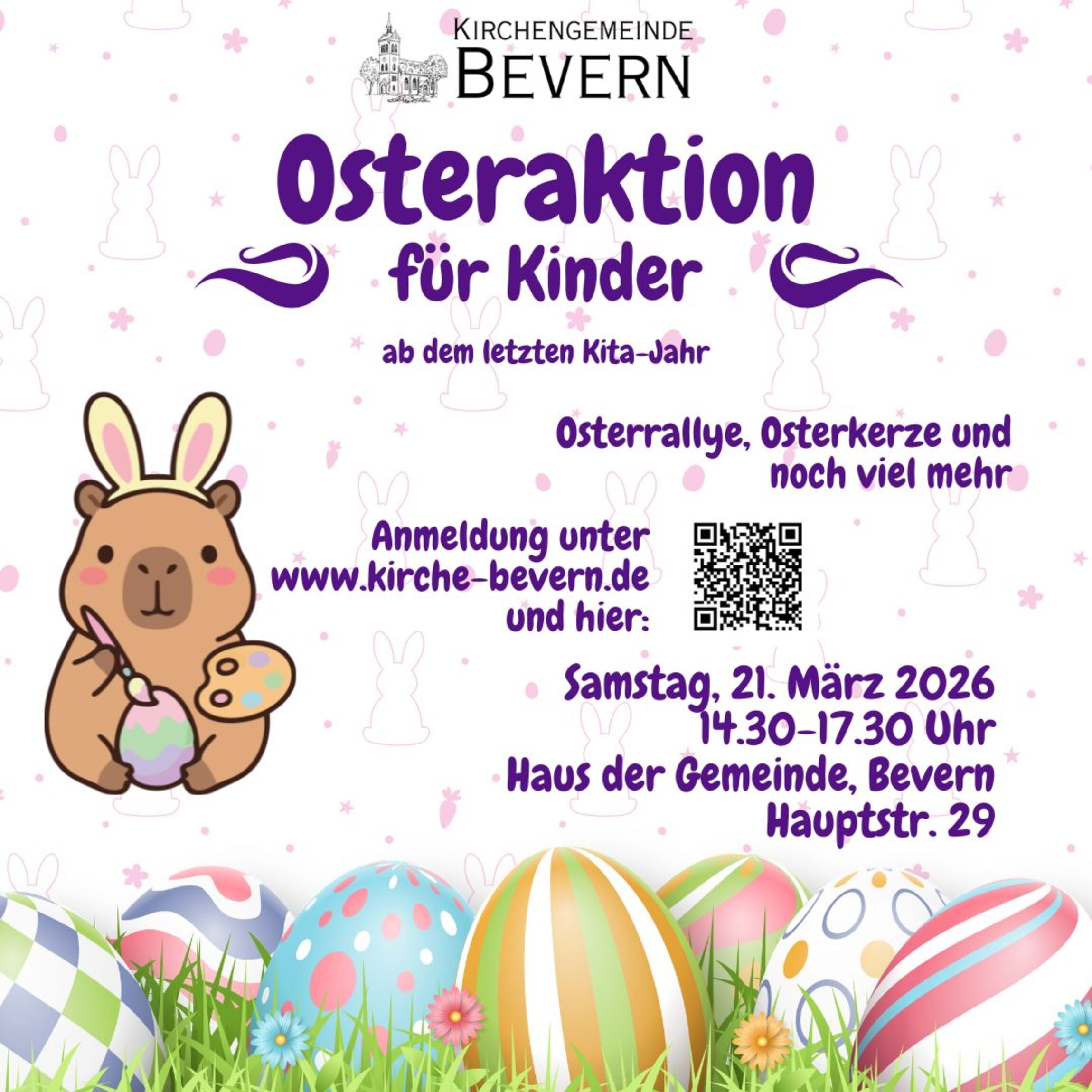 Am Samstag, 21. März 2026 von 14.30 - 17.30 Uhr findet unsere diesjährige Osteraktion statt. Wir starten eine Osterrallye durch Bevern und eine neue Osterkerze für die Kirche müssen wir auch herstellen.