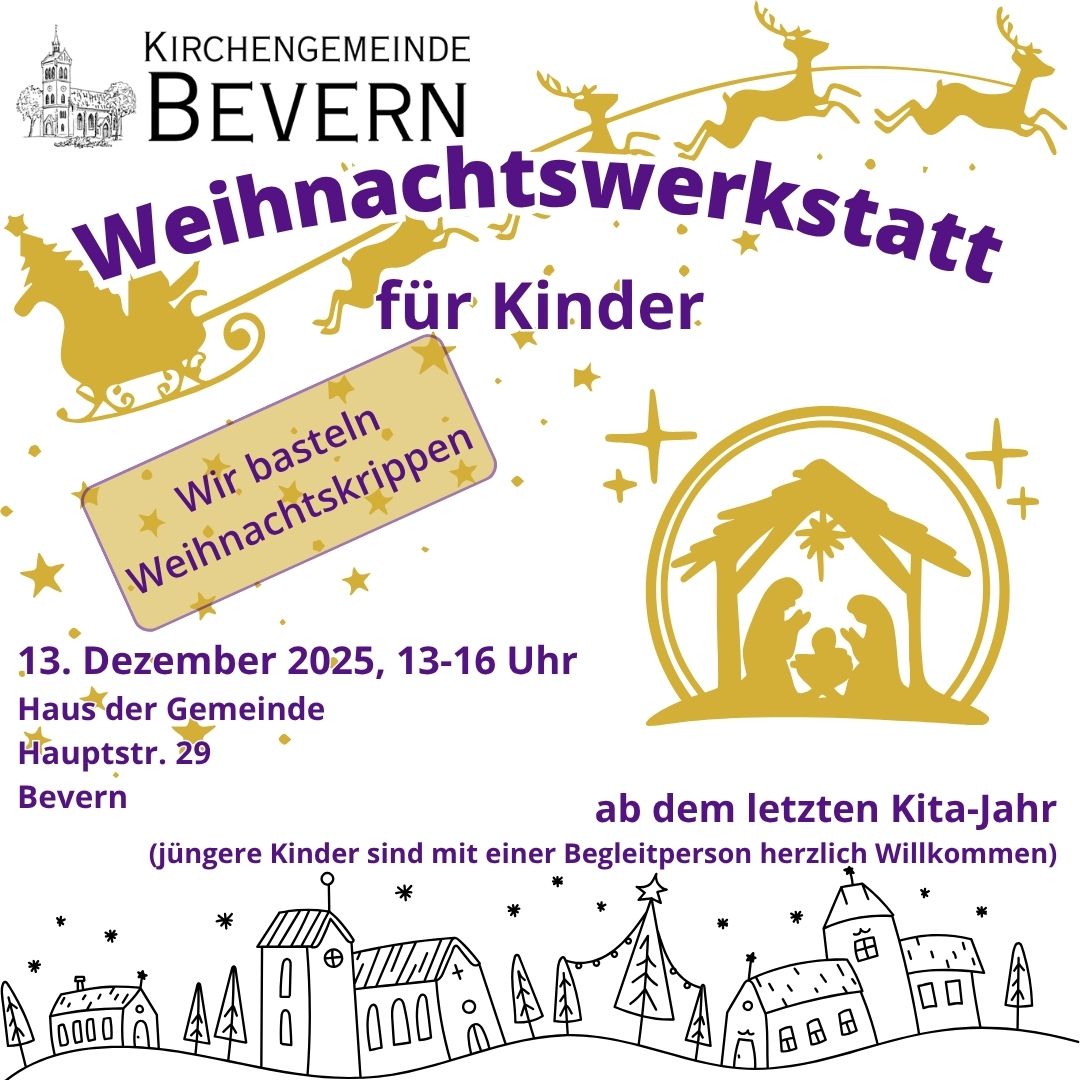 Am Samstag, 13. Dezember 2025 laden wir von 13 - 16 Uhr wieder alle Kinder ab dem letzten Kita-Jahr in unser Haus der Gemeinde, Hauptstr. 29 in Bevern ein. Jüngere Kinder können gerne mit ihren Eltern vorbeikommen (sagt gerne vorher bei Kristian Goletz Bescheid). Wir basteln Weihnachtskrippen und gründen einen Weihnachtschor, der danach im Open Stage-Gottesdienst am 14. Dezember um 18 Uhr und bei der Weihnachtsfeier in der Tagespflege am 19. Dezember um 15 Uhr auftritt.