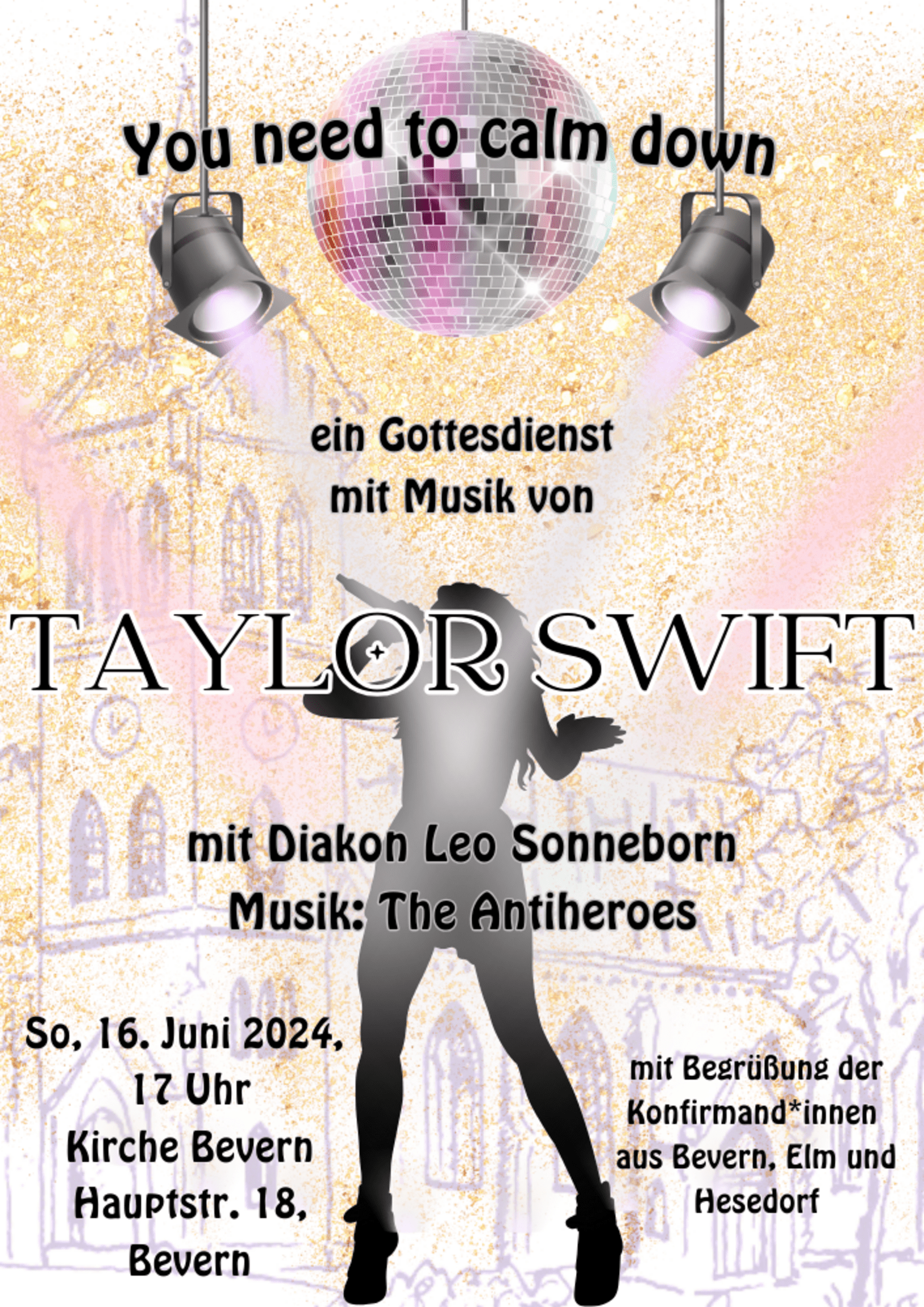 Diakon Leo Sonneborn kommt aus Zeven nach Bevern gereist und hat die extra für diesen Anlass gegründete Band "The Antiheroes" im Gepäck. Sie spielen Lieder von Taylor Swift und auch wenn die Band gerade nicht spielt, wird es um die Sängerin gehen. Es wird schrill, es wird nachdenklich, es wird laut, es wird glitzern - und vor allem: es wird gut! Kommt vorbei am 16. Juni um 17 Uhr in der Kirche Bevern. Wir begrüßen in diesem Gottesdienst auch die neuen Konfirmand*innen aus Bevern, Elm und Hesedorf.